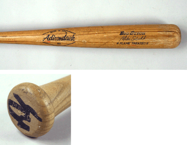 Description:Mike Schmidt professional model Adirondack bat c.1972-79 (EX). 35" Adirondack 302 Mike Schmidt model bat with "MS20" model stamping on the knob end. The bat has "32" (Steve Carlton's uniform #) written in period black marker on the knob end. It appears that the end of the barrel has been corked, meaning that the bat was most likely used during batting practice. Bat shows no cracking but exhibits moderate to heavy usage wear including ball marks, rack marks, and some loss to the finish: EX