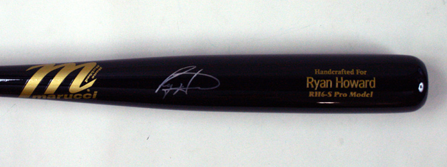 Description:Ryan Howard signed Marucci professional quality baseball bat (NM/MT). 35" Marucci black bat with "Handcrafted For Ryan Howard RH6-S Pro Model" on the barrel. "6" is stamped on the knob end. Howard signed the bat in silver marker. Signature rates 9 out of 10. Bat exhibits minimal to no wear: NM/MT