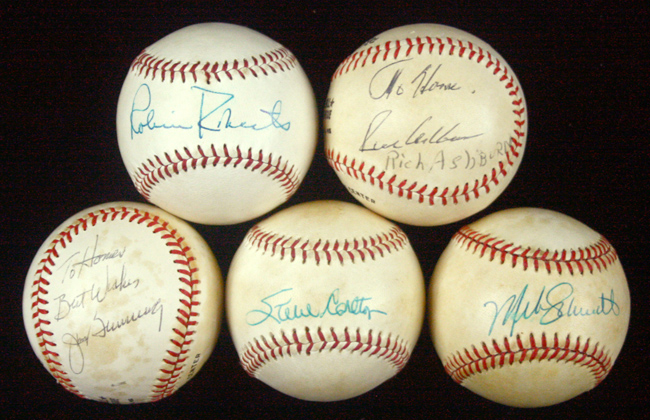 Description:Lot of (5) Philadelphia Phillies HOFers single-signed baseballs (EX-EX/MT). Incl. C.Feeney NL ball (toning) signed by Richie Ashburn (personalized, and identifier written below autograph); Rawlings Major League Specifications ball (light toning) signed by Robin Roberts; C.Feeney NL ball (toning) signed by Mike Schmidt; C.Feeney NL ball (toned) signed by Jim Bunning (personalized); and Wilson Major League Specifications ball (toned) signed by Steve Carlton. Signatures rate 7/8 to 9 out of 10: EX-EX/MT with note to toning