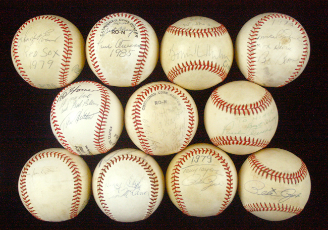 Description:Lot of (11) single and multi-signed baseballs, including Bowie Kuhn (VG/EX-EX/MT) Incl. C.Feeney NL ball (toned) signed by Bowie Kuhn (personalized, and "Comm." identifier written below autograph); (2) C.Feeney NL balls (both toned) signed by Paul Owens (both personalized); C.Feeney NL ball (scuffed) signed by Pete Rose; L.MacPhail AL ball (toned, scuffed) signed by Dwight Evans (team identifier written below autograph); C.Feeney NL ball (toning) signed by Tom Hutton (personalized); C.Feeney NL ball (toned) signed by Dickie Noles (personalized); C.Feeney NL ball (toned) signed by Pete Rose, Tony Taylor, Billy DeMars, and Bob Tiefenauer; C.Feeney NL ball (scuffed) signed by Bob Boone and (2) others; C.Feeney NL ball (toned) signed by Denny Doyle and Tim McCarver (1971 date written on sweet spot); and one unidentified. Signatures rate 5/6 to 8/9 (avg 7/8) out of 10: VG/EX-EX/MT with note to toning