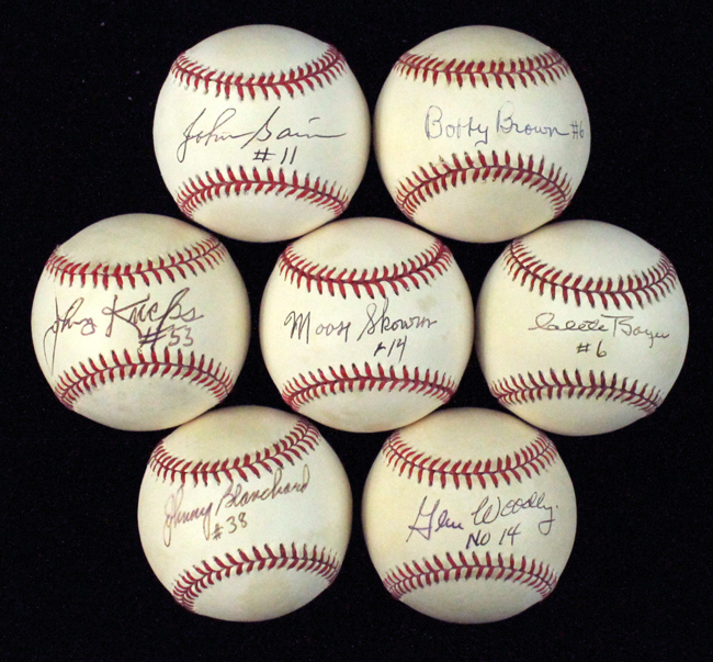 Description:Lot of (7) New York Yankees single-signed baseballs with jersey # inscriptions (EX-EX/MT). Incl. G.Budig AL ball (toning) signed by Johnny Blanchard with "#38" inscription; L.Coleman NL ball (toning) signed by Clete Boyer with "#6" inscription; G.Budig AL ball (light toning) signed by Bobby Brown with "#6" inscription ("blem" whited out on side panel); G.Budig AL ball (toning) signed by John Sain with "#11" inscription ("blem" whited out on side panel); G.Budig AL ball (toning) signed by Moose Skowron with "#14" inscription; B.Brown AL ball (toned) signed by Gene Woodling with "No 14" inscription; and L.Coleman NL ball (toning) signed by Johnny Kucks with "#53" inscription ("blem" whited out on side panel). Signatures rate 7 to 9 (avg 8) out of 10: EX-EX/MT
