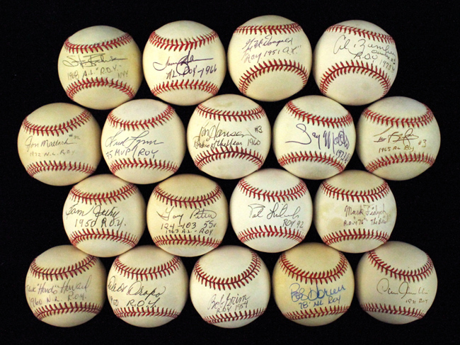 Description:Lot of (18) Rookies of the Year single-signed and inscribed baseballs (EX-EX/MT). Incl. Bob Grim with "ROY 1954" inscription; Walt Dropo with "1950 ROY" inscription; Mark Fidrych with "ROY 76" "The Bird" inscriptions; Gil McDougald with "ROY 1951 AL" inscription; Stan Bahnsen with "1968 AL ROY" "NYY" inscriptions; Curt Blefary with "#3" "1965 AL ROY" inscriptions; Al Bumbry with "Orioles #1" "ROY 1973!!!" inscriptions; Chris Chambliss with "1971 ROY" inscription; Ron Hansen with "#3" "Rookie of the Year 1960" inscriptions; Tommy Helms with "NL ROY 1966" inscription; Bob Horner with "78 NL ROY" inscription; Frank "Hondo" Howard with "1960 NL ROY" inscription; Sam Jethroe with "1950 ROY" inscription; Pat Listach with "ROY 92" inscription; Fred Lynn with "75 MVP ROY" inscription; Jon Matlack with "#32" "1972 NL ROY" inscriptions; Gary Matthews with "1973 ROY" inscription; Gary Peters with "124-103" "5 Sv" "1963 AL ROY" inscriptions. Signatures rate 7 to 9 out of 10. Most show various degrees of toning, with some having "blem" whited out on side panel: EX-EX/MT