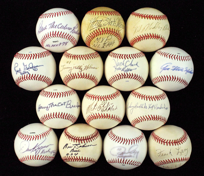 Description:Lot of (14) single-signed baseballs with nickname inscriptions (VG-NM). Incl. Harry The Cat Brecheen; Tommy "Kelly" Holmes with "#1" inscription; Bill Mad Dog Madlock; Marty Slats Marion with "MVP NL 1944" inscription; Gene "Stick" Michael; Dave The Cobra Parker with "NL MVP 78" inscription; Johnny Double No Hit Vander Meer with "6/11/38" "6/15/38" inscription; Ron Cey with "Penguin" inscription; Jack Clark with "The Ripper" inscription; Mike Easler with "Hit Man" inscription; Rich Gedman with "Geddy" inscription; Bill Johnson with "Bull" "#24" inscriptions; Dave Kingman with "Kong" "442 HR" inscriptions; and Frank Lary with "No. 17" "Yankee Killer" inscription. Signatures rate 7 to 9 out of 10. Most appear to grade EX overall with various degrees of toning. Some have "blem" whited out on side panel: VG-NM