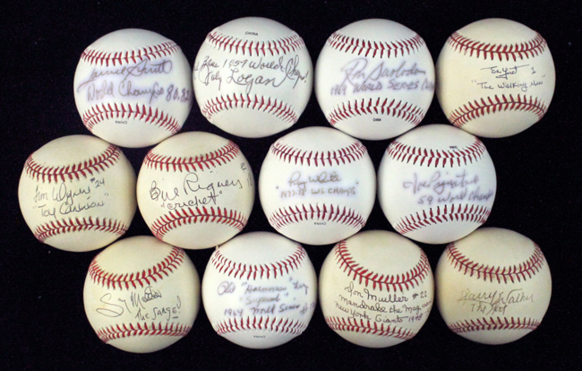 Description:Lot of (12) single-signed and inscribed baseballs (EX-NM). Incl. Rawlings Official League ball signed by Phil "Harmonica" Linz w/ "Supersub" "1964 World Series" "#12" inscriptions; W.White NL ball (light toning) signed by Gary Matthews w/ "The Sarge!" inscription; L.Coleman NL ball (light toning) signed by Don Mueller w/ "#22" "Mandrake The Magician" "New York Giants 1948-57" inscription ("blem" whited out on side panel); L.Coleman NL ball (light toning) signed by Bill Rigney w/ "#18" "Cricket" inscription ("blem" whited out on side panel); L.Coleman NL ball (toning) signed by Harry Walker w/ "The Hat" inscription; L.Coleman NL ball (light toning) signed by Jim Wynn w/ "#24" "Toy Cannon" inscription; B.Brown AL ball (light toning) signed by Ed Yost w/ "The Walking Man" inscription; Johnny Logan w/ "Mil. Braves 1957 World Champs!" inscription; Joe Pignatano w/ "59 World Champs" inscription; Lonnie Smith w/ "World Champ 80, 82, 85" inscription; Ron Swoboda w/ "1969 World Series Champs" inscription; Roy White w/ "1977-78 WS Champs" inscription. Signatures rate 7 (Linz, Walker) to 9 out of 10: EX-NM