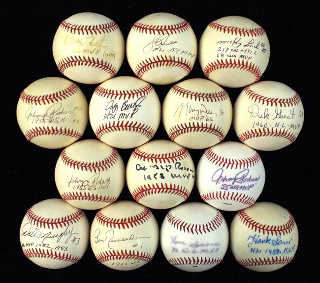 Description:Lot of (14) single-signed baseballs with MVP inscriptions (EX-EX/MT). Incl. Jeff Burroughs with "1974 MVP" inscription; Bucky Dent with "#20" "1978 WS MVP" inscriptions; George Foster with "NL MVP 1977" inscription; Dick Groat with "1960 NL MVP" inscription; Mickey Lolich with "#29" "217W-191L" "68 WS MVP" inscriptions; Dale Murphy with "#3" "NL MVP 1982, 1983" inscriptions; (3) Johnny Podres with "1955 WS MVP" inscription added to each; Bobby Richardson with "#1" "1960 WS MVP" inscriptions; Al "Flip" Rosen with "1953 MVP" "#7" inscriptions; Hank Sauer with "NL 1952 MVP" inscription; Gene Tenace with "72 WS MVP" inscription; and Maury Wills with "MVP 62" inscription. Signatures rate 6 (Foster) to 9/10 (avg 8) out of 10. Most show various degrees of toning, with some having "blem" whited out on side panel: EX-EX/MT