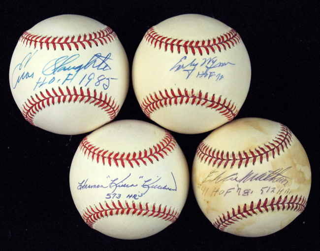 Description:Harmon "Killer" Killebrew, Eddie Mathews, Enos Slaughter, Early Wynn single-signed & inscribed baseballs (VG/EX-EX/MT). Incl. G.Budig AL ball signed by Harmon "Killer" Killebrew with "573 HR's" inscription ("blem" erased on side panel); L.Coleman NL ball signed by Eddie Mathews with "#41" "HOF 78" "512 HRs" inscriptions (VG/EX, heavy toning); W.White NL ball signed by Enos Slaughter with "HOF 1985" inscription; and G.Budig AL ball signed by Early Wynn with "HOF 72" inscription. Signatures rate 7/8 (Mathews) to 9/10 out of 10. All show various degrees of toning: VG/EX-EX/MT