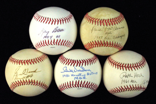 Description:Lot of (5) Managers single-signed and inscribed baseballs (VG-NM). Incl. C.Feeney NL ball (VG, usage wear) signed by Paul "Pope" Owens with "Mgr 1983 NL Champs" inscription; L.Coleman NL ball (toning) signed by Gene Mauch with "Phillies #4" inscription ("blem" whited out on side panel); G.Budig AL ball signed by Ralph Houk with "1961 Man" "1619 Wins" inscriptions; Rawlings Official League ball signed by Larry Bowa with "MOY 01" inscription; and Rawlings Official League ball signed by Bill Virdon with "1980 Houston Astros MGR" inscription. Signatures rate 7 (Bowa ink bleeding) to 9 out of 10: VG-NM