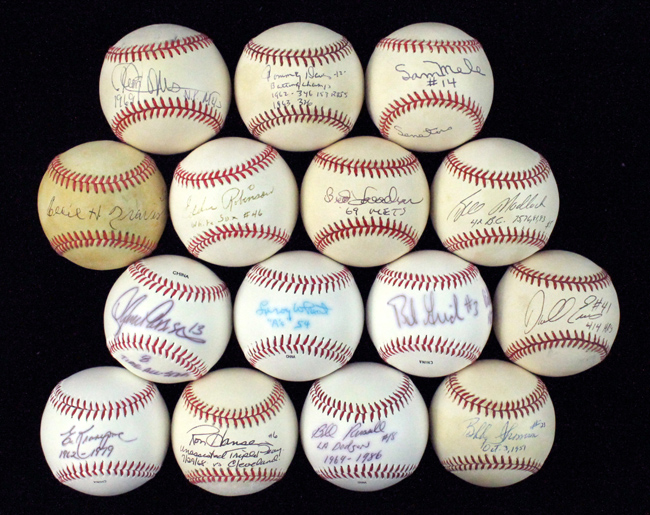 Description:Lot of (15) single-signed and inscribed baseballs (VG-NM). Incl. Tommy Davis with "Batting Champ" "1962 - .346 153 RBIs" "1963 .326" inscriptions; Darrell Evans with "#41" "414 HRs" inscriptions; Bob Grich with "#3" "Gold Glove 1973-76" inscriptions; Ron Hansen with "#6" "unassisted Triple Play 7/29/68 vs Cleveland" inscriptions; Bud Harrelson with "69 Mets" inscription; Cleon Jones with "1969 NY Mets" inscription; Ed Kranepool with "1962-1979" inscription; Bill Madlock with "4X BC 75, 76, 81, 83" "#5" inscriptions; Sam Mele with "#14" "Senators" inscriptions; Lance Parrish with "8 Time All-Star" inscription; Eddie Robinson with "White Sox #46" inscription; Bill Russell with "LA Dodgers #18" "1969-1986" inscriptions; Bobby Thomson with "#23" "Oct. 3, 1951" inscriptions; Cecil Travis with "Senators" "Unif. #5" inscriptions; and Leroy Wheat with "A's" "54" inscription. Signatures rate 7 to 9/10 (avg 8) out of 10. Most appear to grade EX overall, with most having various degrees of toning. Some have "blem" whited out on side panel: VG-NM