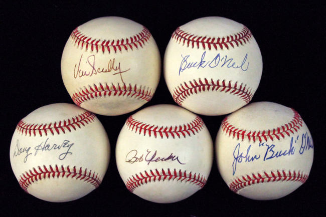 Description:Lot of (5) stars and HOFers single-signed baseballs (EX-EX/MT). Incl. L.Coleman NL ball signed by Bob Uecker; L.Coleman NL ball signed by Vin Scully; G.Budig AL ball signed by John "Buck" O'Neil ("blem" erased on side panel); G.Budig AL ball signed by Buck O'Neil; and L.Coleman NL ball signed by Doug Harvey. Signatures rate 7/8 (Uecker, Scully) to 9/10 out of 10. All show areas of light to moderate toning / surface wear: EX-EX/MT