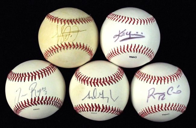 Description:Lot of (5) modern players single-signed baseballs (EX-NM). Incl. Rawlings Official League ball signed by Robinson Cano; G.Budig AL ball (toning) signed by C.C. Sabathia; Rawlings Official League ball signed by Adrian Gonzalez; Rawlings Official League ball signed by Jose Reyes; and Rawlings Official League ball signed by Kevin Youkilis. Signatures rate 7 (Sabathia ink discoloration) to 8/9 out of 10: EX-NM