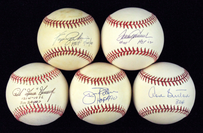 Description:Lot of (5) HOF Pitchers single-signed and inscribed baseballs (EX-EX/MT). Incl. G.Budig AL ball signed by Rich "Goose" Gossage with "121W-107L" "310 Saves" inscriptions ("blem" erased on side panel); L.Coleman NL ball signed by Fergie Jenkins with "HOF 7/21/91" inscription; B.Brown AL ball signed by Jim Palmer with "HOF 1990" inscription; W.White NL ball signed by Tom Seaver with "#41" "HOF 92" inscriptions; and L.Coleman NL ball signed by Don Sutton with "324" win total inscription. Signatures rate 8 to 9/10 out of 10. All show areas of light to moderate toning: EX-EX/MT