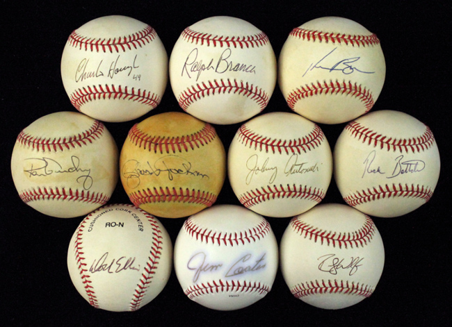Description:Lot of (10) pitchers single-signed baseballs (VG-NM). Incl. L.Coleman NL ball (light toning) signed by Johnny Antonelli ("blem" whited out on side panel); W.White NL ball (toning) signed by Rick Bottalico; L.Coleman NL ball (toning) signed by Ralph Branca; L.Coleman NL ball (toning) signed by Kevin Brown; Rawlings Official League ball signed by Jim Coates; L.Coleman NL ball (light toning) signed by Dock Ellis; G.Budig AL ball (toning) signed by Ron Guidry ("blem" erased on side panel); L.Coleman NL ball (toning) signed by Charlie Hough; C.Feeney NL ball (heavily toned) signed by Grant Jackson; and L.Coleman NL ball signed by Randy Wolf. Signatures rate 7 (Coates) to 9/10 (avg 8) out of 10: VG-NM