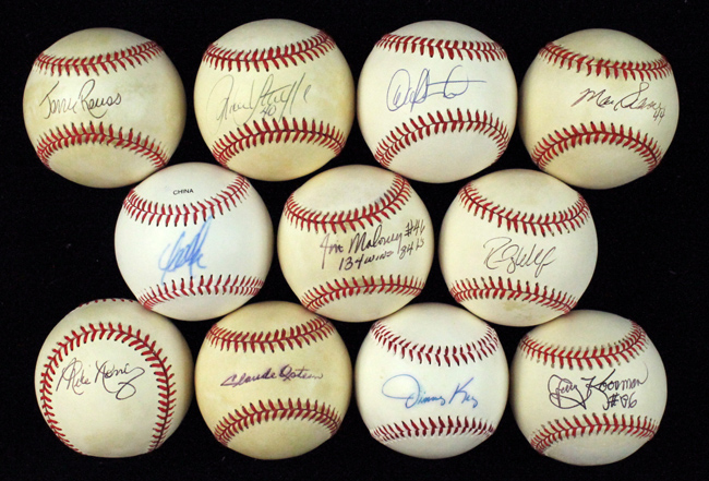Description:Lot of (11) pitchers single-signed baseballs (EX-NM). All signed on official NL or AL balls unless noted otherwise. Includes Jimmy Key (Power Bolt Official League ball), Jerry Koosman with "#36" inscription ("blem" whited out on side panel), Jim Maloney with "#46" "134 Wins 84 L's" inscriptions, Mike Norris, Claude Osteen, Dan Plesac (Rawlings Official League ball), Jerry Reuss, Mac Scarce, Dave Stewart, Rick Sutcliffe, and Randy Wolf ("blem" whited out on side panel). Signatures rate 7 (Key, Osteen) to 9/10 (avg 8) out of 10. Most exhibit various degrees of toning: EX-NM