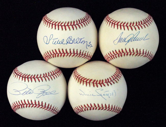 Description:Willie Stargell, Steve Carlton, Tom Seaver, Pete Rose single-signed baseballs (EX-NM). Incl. W.White NL ball (light toning) signed by Willie Stargell; W.White NL ball (light toning) signed by Steve Carlton with "32" inscription; W.White NL ball (light toning) signed by Tom Seaver; and W.White NL ball signed by Pete Rose. Signatures rate 8/9 to 9/10 out of 10: EX-NM
