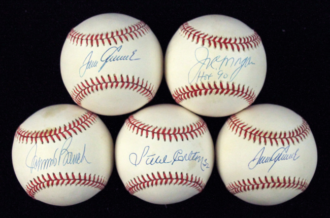 Description:Lot of (5) HOFers single-signed baseballs (EX-NM). Incl. W.White NL ball (toning) signed by Steve Carlton with "32" inscription; W.White NL ball (toning) signed by Johnny Bench; W.White NL ball (toning) signed by Joe Morgan with "HOF 90" inscription; and (2) W.White NL balls signed by Tom Seaver. Signatures rate 8/9 to 9/10 out of 10: EX-NM