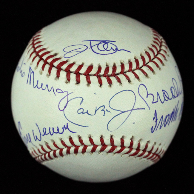 Description:Baltimore Orioles Hall of Famer multi-signed B.Selig MLB baseball with (6) signatures (NM/MT). There are (6) signatures on the ball including Cal Ripken Jr., Eddie Murray, Earl Weaver, Brooks Robinson, Frank Robinson, and Jim Palmer. All are signed in blue ink and rate 9 to 10 out of 10: NM/MT