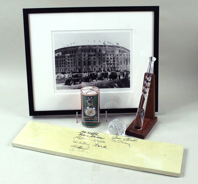 Description:New York Yankees lot including multi-signed pitching rubber (EX/MT-NM). Incl. pitching rubber signed by (11) including Whitey Ford, Johnny Kucks, John Sain, Bill Stafford, Rollie Sheldon, Ryne Duren, Hal Reniff, Art Ditmar, Al Downing, Jim Coates, and Bud Daley. Signatures rate 4 (Kucks, Sain, Downing) to 9 (avg 8) out of 10. Also includes 1968 Yankees pocket watch by Westclox still in original package; 1999 Yankees World Series Champions commemorative crystal ball by Waterford; 2000 Yankees World Series Champions commemorative crystal bat; and approx. 11"x13" Yankee Stadium photo from the New York Times Photo Collection (framed 17"x21"): EX/MT-NM