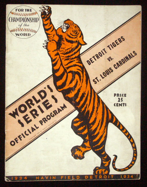 Description:1934 World Series program, St. Louis Cardinals at Detroit Tigers (VG). Original program issued for 1934 World Series game between the Cardinals vs Tigers played at Navin Field. Exhibits moderate age and handling wear with a vertical fold crease. Unscored, with interior scorecard page detached: VG