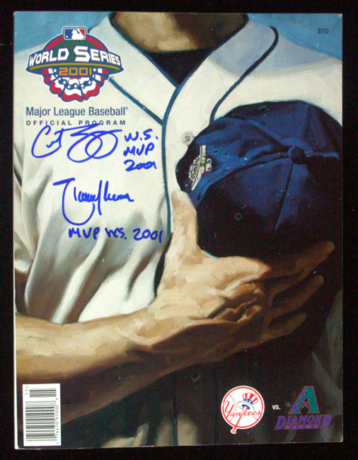 Description:Randy Johnson and Curt Schilling dual-signed and inscribed 2001 World Series program (EX/MT-NM). Schilling signed the cover in blue marker and added "WS MVP 2001" inscription, and Johnson signed the cover in blue marker and added "MVP WS 2001" inscription. Signatures rate 9 to 10 out of 10. Exhibits minor surface wear: EX/MT-NM
