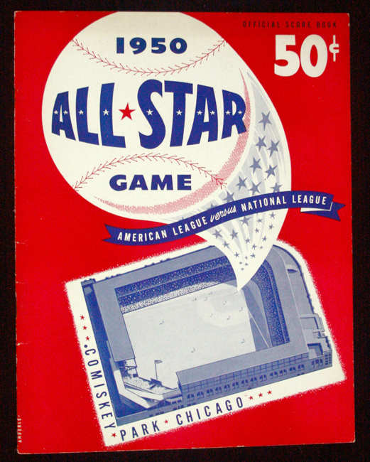 Description:1950 All-Star Game program (EX). Original program from the 1950 All-Star Game which was played at Comiskey Park in Chicago, and won 4-3 by the National League on a 14th inning HR by Red Schoendienst. Unscored, with the front cover and the interior showing only minor wear, but the back cover has light surface loss along the left edge: EX