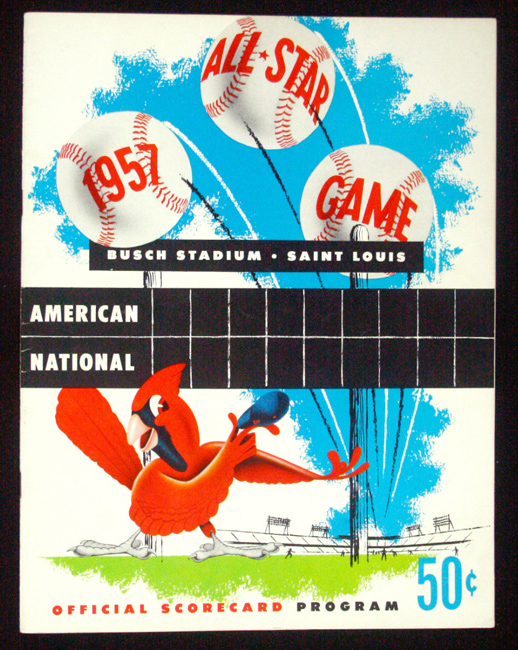 Description:1957 All-Star Game program (EX/MT-NM). Original program from the 1957 All-Star Game which was played at Busch Stadium (Sportsman's Park) in St. Louis. Exhibits minor handling wear, and is neatly scored in pencil. Some pencil impressions go through to the pages next to the scorcard pages: EX/MT-NM