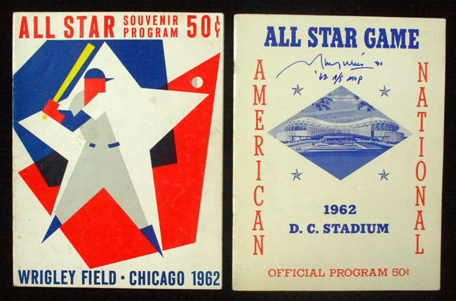 Description:Pair of 1962 All-Star Game programs, both games, including (1) signed & inscribed by Maury Wills (EX-NM). Incl. July 10th 1962 All-Star Game program signed by Maury Wills with "62 A/S MVP" inscription rating 9/10 out of 10 (EX/MT-NM, unscored); and July 30th 1962 All-Star Game program (EX, scored in pencil but difficult to read). Range: EX-NM