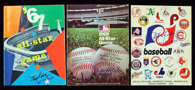 Description:Tony Perez, Willie McCovey, Carl Yastrzemski single-signed & inscribed All-Star Game programs from 1967-1970 (EX-NM). Incl. 1967 program signed by Tony Perez with "67 AS MVP" inscription in a different color marker; 1969 program signed by Willie McCovey with "MVP 69" inscription; and 1970 program signed by Carl Yastrzemski with "MVP 1970" inscription. Signatures rate 8/9 to 10 out of 10: EX-NM