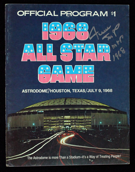 Description:Willie Mays signed and inscribed 1968 All-Star Game program (EX/MT). Mays signed the cover in silver marker and added "MVP 1968" inscription. Signature rates 9 out of 10. Unscored, with light overall handling wear: EX/MT