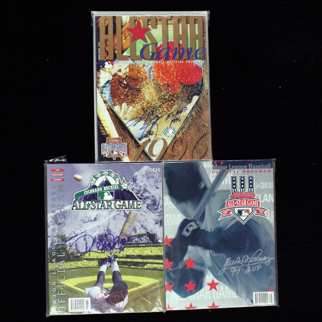 Description:Mike Piazza, Sandy Alomar Jr., Roberto Alomar single-signed & inscribed All-Star Game programs from 1996-1998 (NM). Incl. 1996 program signed by Mike Piazza with "AS MVP 1996" inscription (Catch 31 Mike Piazza Authentic); 1997 program signed by Sandy Alomar Jr with "97 MVP" inscription; and 1998 program signed by Roberto Alomar with "MVP" inscription. Signatures rate 9 to 10 out of 10: NM