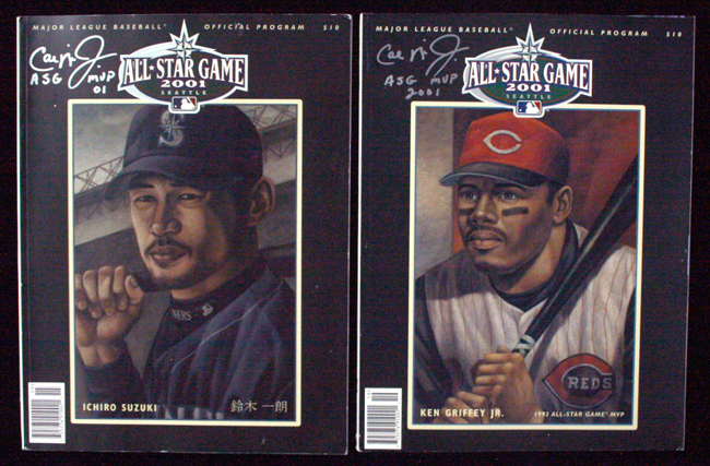 Description:Lot of (2) Cal Ripken Jr. signed and inscribed 2001 All-Star Game programs (NM). Incl. Ken Griffey Jr cover version signed by Ripken in silver marker with "ASG MVP 2001" inscription; and Ichiro Suzuki cover version signed by Ripken in silver marker with "ASG MVP 01" inscription. Signatures rate 9 to 10 out of 10: NM