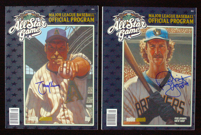 Description:Robin Yount and Randy Johnson single-signed 2002 All-Star Game programs (NM). Incl. Robin Yount cover version signed by Yount in blue marker with "HOF 99" inscription; and Randy Johnson cover version signed by Johnson in blue marker. Signatures rate 9 to 10 out of 10: NM