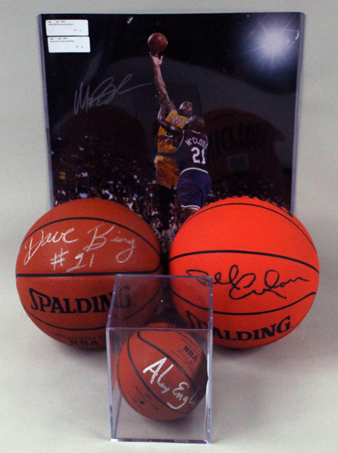 Description:Basketball HOFers autograph lot including Magic Johnson, Billy Cunningham, Dave Bing, Alex English (EX/MT-NM). Incl. D.Stern NBA basketball signed by Dave Bing with "#21" inscription; Spalding NBA All-Surface basketball signed by Billy Cunningham; Spalding NBA mini basketball signed by Alex English; and 16"x20" photo signed by Magic Johnson. Signatures rate 8/9 to 10 out of 10: EX/MT-NM