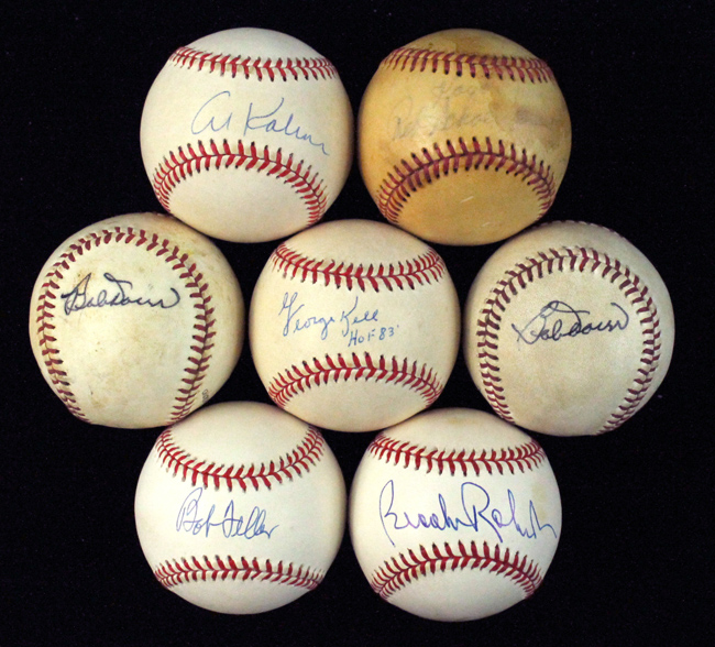 Description:Lot of (7) HOFers single-signed baseballs (VG-EX/MT). Incl. G.Budig AL ball signed by Bob Feller; G.Budig AL ball (light toning) signed by George Kell with "HOF 83" inscription; (2) C.Flood Senior Professional Baseball Association balls signed by Bob Doerr (both VG with usage wear); G.Budig AL ball (light toning) signed by Al Kaline; L.Coleman NL ball (toning) signed by Brooks Robinson; and C.Feeney NL ball (toned) signed by Red Schoendienst. Signatures rate 2 (Schoendienst) to 9/10 (avg 8) out of 10: VG-EX/MT