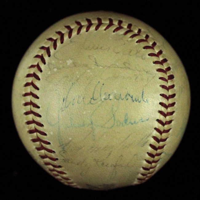 Description:1957 Brooklyn Dodgers team-signed W.Giles NL baseball, JSA (EX). There are (26) signatures on the ball including Roy Campanella, Sandy Koufax, Pee Wee Reese, Walt Alston, Duke Snider, Karl Spooner, Carl Furillo, Jake Pitler, Gil Hodges, Happy Felton, Emmet Kelly, Carl Erskine, Johnny Podres, Elmer Valo, Sandy Amoros, Roger Craig, and others. All are signed in ink and rate 5 to 6 out of 10 on average with a few slightly lesser or better quality. Ball exhibits light even toning and minor surface wear. Includes a full LOA from JSA: EX