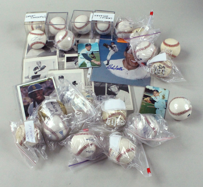 Description:Lot of assorted baseball memorabilia & autographs including (32) signed baseballs (PR-NM). Signed baseballs include Bobby Bonds (VG, usage wear), Bob Boone, Tom Brookens with "1984 Detroit Tigers World Series Champs" inscription, Dave Concepcion, Tommy Davis with "NL Batting Champ 1962 1963" inscription, Carlos Delgado, Travis Fryman, Dwight Gooden, Bake McBride, Jim Perry with "1970 Cy Young" inscription, Johnny Pesky, Bret Saberhagen, Rusty Staub, Sandy Alomar Jr, Jason Giambi, and others. Signatures rate 5/6 (Bonds) to 10 (avg 8) out of 10 (EX overall with some showing usage wear, VG-NM). Also includes 8"x10" photo signed by Bob Feller in blue marker rating 9 out of 10; 1956 Topps #200 Bob Feller (PR); 1970 Topps Super #4 Harmon Killebrew (PR); (3) May 6th 2001 Baltimore Orioles full tickets from game vs New York Yankees in which Cal Ripken Jr broke Brooks Robinson's record of games played for the Orioles (EX/MT-NM); and other items: PR-NM