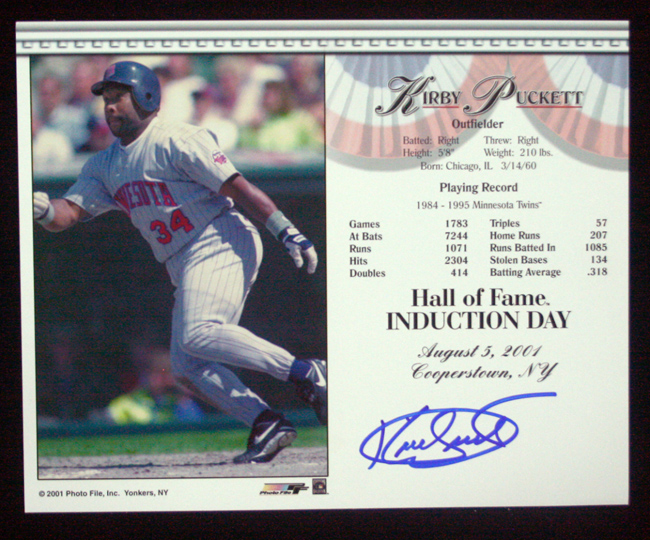 Kirby Puckett signed 8"x10" HOF Induction Day photo card (NM). Puckett signed beside his image in blue marker. Signature rates 9/10 out of 10: NM