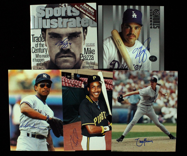 Description:Lot of (5) modern baseball stars autographs (EX/MT-NM). Incl. 1997 Donruss Studio 8"x10" photo signed by Mike Piazza (Catch 31 Mike Piazza Authentic); (3) other signed 8"x10" photos including Rickey Henderson, Barry Bonds, and Randy Johnson; and May 25th 1998 Sports Illustrated signed by Mike Piazza. Signatures rate 8/9 to 10 out of 10: EX/MT-NM