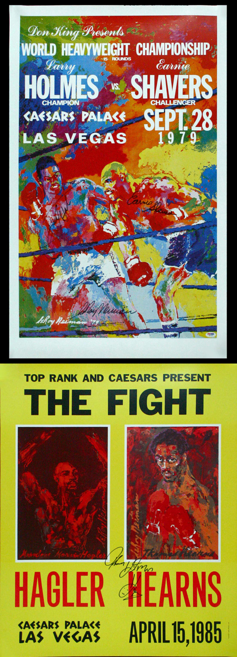Description:Lot of (2) signed boxing posters, including HOFers (EX/MT-NM). Incl. 21"x34" Larry Holmes vs Earnie Shavers poster by LeRoy Neiman, signed by Holmes, Shavers, and Neiman in black marker (PSA/DNA); and 25"x31" Marvin Hagler vs Thomas Hearns poster signed by Hearns in black marker with "The Hitman" inscription. Signatures rate 8 to 9/10 out of 10: EX/MT-NM