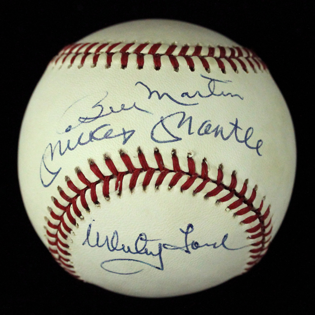 Description:Mickey Mantle, Billy Martin, & Whitey Ford multi-signed B.Brown AL baseball, PSA/DNA (EX/MT). Mantle and Martin signed the sweet spot and Ford signed the bottom panel. All three signatures are in blue ink and rate 9 out of 10 on average ("B" in Billy is slightly lighter). Ball exhibits very minimal toning. Includes a full LOA from PSA/DNA: EX/MT