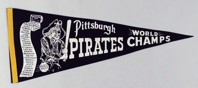 Description:1960 Pittsburgh Pirates World Champs pennant (EX/MT). 29" black pennant featuring a scroll at the left listing names of team members, with an image of a Pirate alongside. "Pittsburgh Pirates" "World Champs" is lettered in white across the pennant. Exhibits minor wear with small tack holes visible: EX/MT
