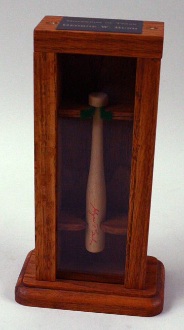 Description:George Bush (43rd President) signed mini baseball bat display (NM). 3.5"x5"x10" wooden display containing a mini bat signed by Bush in red marker. Signature rates 9 out of 10: NM