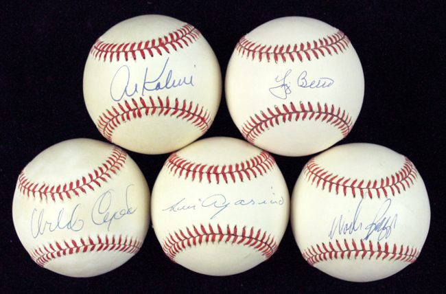 Description:Lot of (5) HOFers single-signed baseballs (EX-NM). Incl. B.Brown AL ball (light toning) signed by Luis Aparicio (JSA); G.Budig AL ball signed by Yogi Berra; B.Brown AL ball (light toning) signed by Wade Boggs; W.White NL ball (toning) signed by Orlando Cepeda (JSA); and B.Brown AL ball (toning) signed by Al Kaline. Signatures rate 8 to 9/10 out of 10: EX-NM