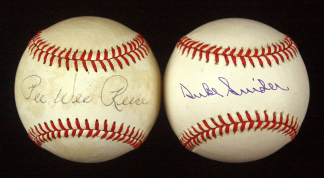Description:Pee Wee Reese and Duke Snider single-signed baseballs (EX-EX/MT). Incl. C.Feeney NL ball (toned) signed by Pee Wee Reese in black ink rating 8 out of 10; and W.White NL ball (light toning) signed by Duke Snider in blue ink rating 9/10 out of 10: EX-EX/MT