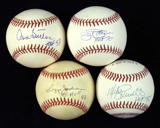 Description:Mike Schmidt, Reggie Jackson, Jim Palmer, Don Sutton single-signed & inscribed baseballs (EX-EX/MT). Incl. 1995 HOF Induction ball (light wear) signed by Mike Schmidt with "HOF 95" inscription; B.Brown AL ball (toned) signed by Reggie Jackson with "HOF 93" inscription; B.Selig ML ball (light wear) signed by Jim Palmer with "HOF 90" inscription; and B.Selig ML ball (light toning) signed by Don Sutton with "HOF 98" inscription. Signatures rate 8 to 10 out of 10: EX-EX/MT