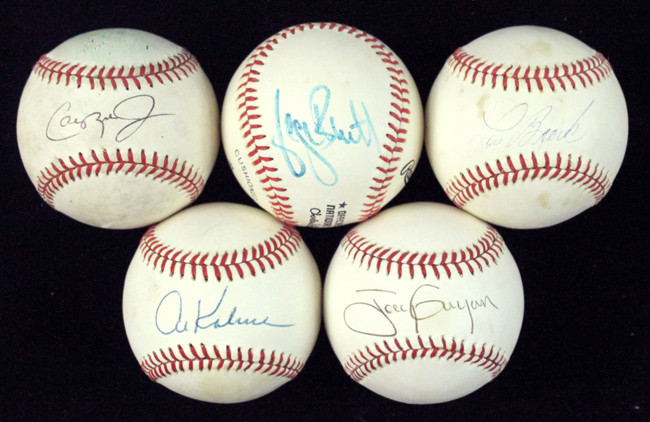 Description:Lot of (5) 3000 Hit Club members single-signed baseballs (VG/EX-EX/MT). Incl. C.Feeney NL ball signed by George Brett; C.Feeney NL ball signed by Lou Brock; W.White NL ball signed by Tony Gwynn; C.Feeney NL ball signed by Al Kaline; and G.Budig AL ball (VG/EX, usage wear) signed by Cal Ripken Jr. Signatures rate 6/7 (Brock) to 10 (avg 8) out of 10. All show various degrees of toning: VG/EX-EX/MT
