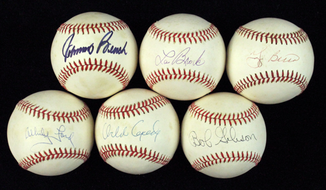 Description:Lot of (6) HOFers single-signed baseballs (EX-EX/MT). Incl. C.Feeney NL ball signed by Johnny Bench; W.White NL ball signed by Yogi Berra; W.White NL ball signed by Lou Brock; W.White NL ball signed by Orlando Cepeda; B.Brown AL ball signed by Whitey Ford; and C.Feeney NL ball signed by Bob Gibson. Signatures rate 7 to 9/10 (avg 8) out of 10. All show various degrees of toning: EX-EX/MT
