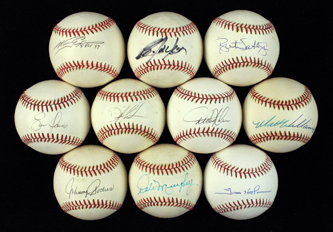 Description:Lot of (10) single-signed baseballs (EX-NM). Incl. W.White NL ball (toning) signed by Johnny Podres; B.Giamatti NL ball (toning) signed by Bo Jackson; W.White NL ball (toning) signed by Dale Murphy; L.Coleman NL ball (light toning) signed by Nomar Garciaparra with "ROY 97" inscription; W.White NL ball signed by Eric Davis; W.White NL ball (light toning) signed by Dwight Gooden; B.Selig MLB ball signed by Trevor Hoffman; B.Selig MLB 2004 Citizens Bank Park Inaugural Season ball signed by Dickie Noles; L.Coleman NL ball (toning) signed by Bret Saberhagen; and W.White NL ball (toning) signed by Matt Williams. Signatures rate 7 to 9 out of 10: EX-NM