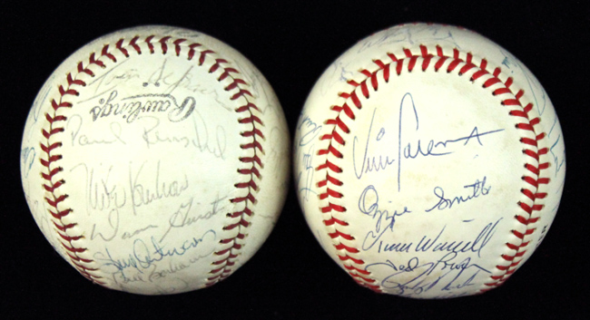 Description:1977 Chicago Cubs and 1989 St. Louis Cardinals team signed baseballs (EX-EX/MT). Incl. Rawlings Chicago Cubs ball signed by (27) members of the 1977 Cubs including Herman Franks, Bruce Sutter, George Mitterwald, Bill Buckner, Manny Trillo, Ivan DeJesus, Steve Ontiveros, Jose Cardenal, Jerry Morales, Bobby Murcer, Larry Biittner, Greg Gross, Gene Clines, Rick Reuschel, Ray Burris, Bill Bonham, Mike Krukow, Willie Hernandez, and others; and W.White NL ball signed by (22) members of the 1989 Cardinals including Whitey Herzog, Red Schoendienst, Ozzie Smith, Tony Pena, Pedro Guerrero, Jose Oquendo, Terry Pendleton, Vince Coleman, Milt Thompson, Tom Brunansky, Jose DeLeon, Ken Hill, Scott Terry, Todd Worrell, and others. Signatures rate 6 to 10 (avg 8) out of 10. Both show areas of light to moderate toning: EX-EX/MT