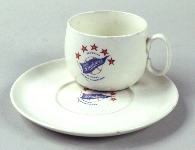 Description:1952 Brooklyn Dodgers National League Champions cup and saucer set (EX-EX/MT). Seldom seen cup and saucer set issued in 1952 to commemorate the Brooklyn Dodgers National League Championship. Red and blue graphics decorate the sides of the cup and center of the plate. The bottom of the plate is marked "With Sincere Appreciation From The Dodgers - National League champions - 1952" and has a Delano Studios manufacturer mark. Displays well overall with some minimal surface wear: EX-EX/MT