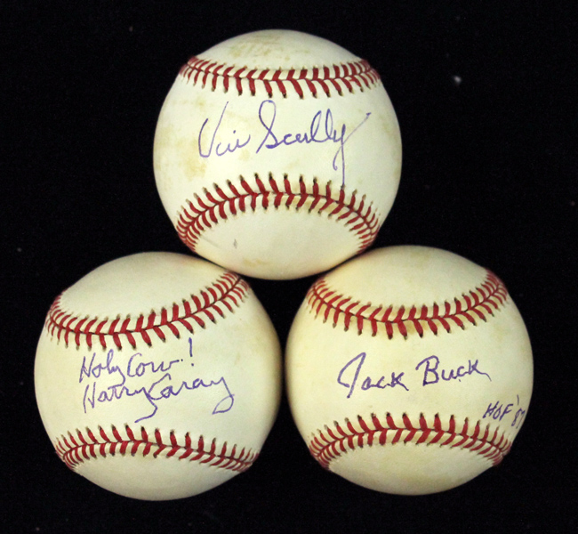Description:Jack Buck, Harry Caray, and Vin Scully single-signed baseballs (EX-EX/MT). Incl. L.Coleman NL ball signed by Jack Buck with "HOF 87" inscription; L.Coleman NL ball signed by Harry Caray with "Holy Cow!" inscription; and L.Coleman NL ball signed by Vin Scully. Signatures rate 8/9 to 9 out of 10. All show areas of light to moderate toning: EX-EX/MT